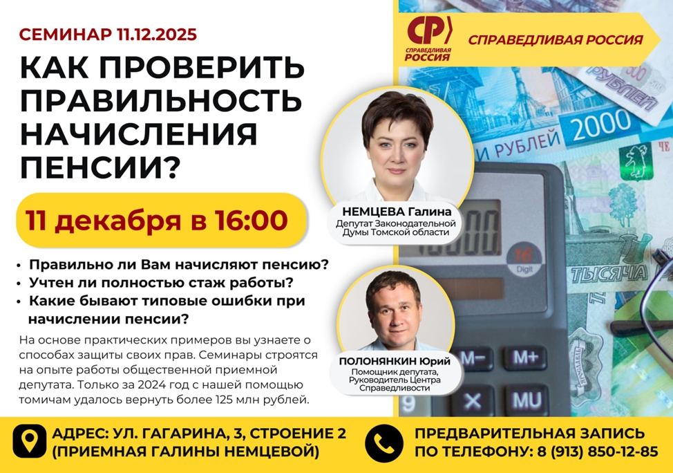 Семинар "Как проверить правильность начисления пенсии?" – один из многих в серии образовательных семинаров, которые партия СПРАВЕДЛИВАЯ РОССИЯ – ЗА ПРАВДУ проводит для томичей в рамках проекта по повышению правовой грамотности населения. Не все знают, как часто возникают ошибки в расчетах СФР. Тем временем специалисты депутатской приемной активно работают в этом направлении и добиваются перерасчетов. Всего за прошлый год удалость вернуть томичам 125 млн рублей, часть этой суммы приходится и на перерасчеты пенсий.