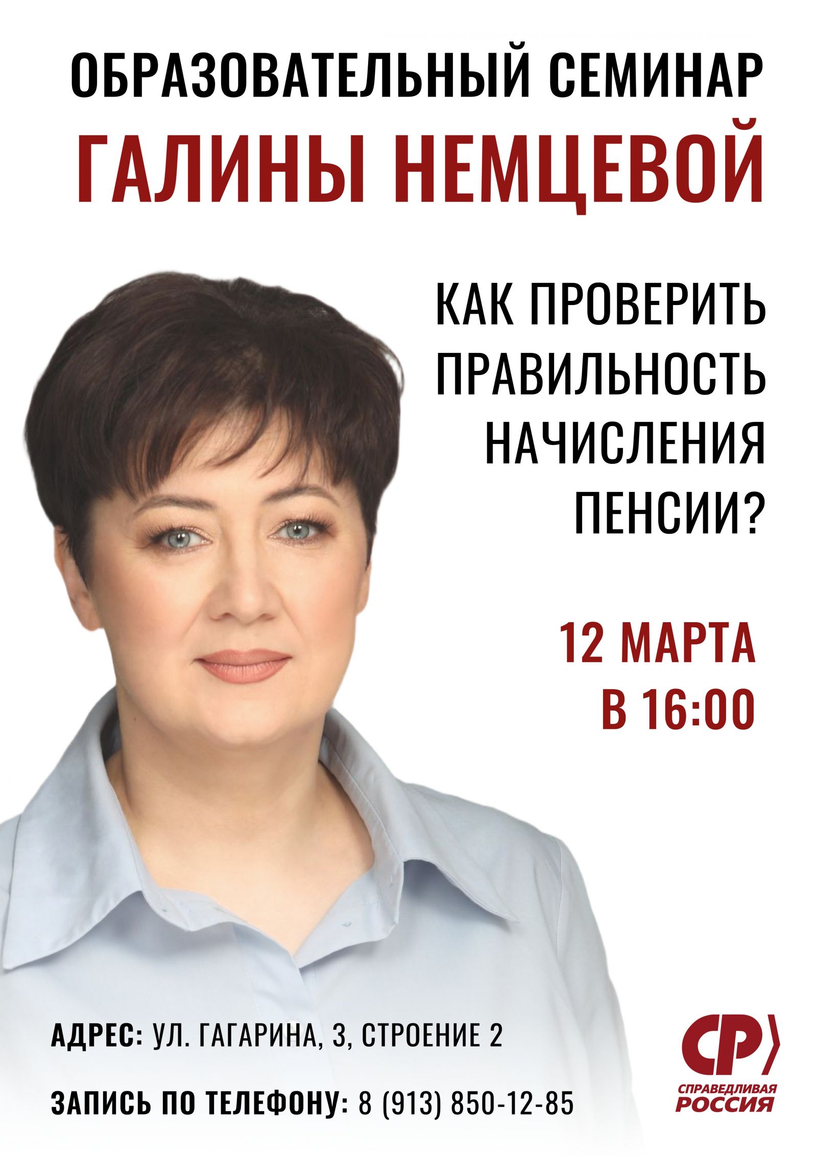 В этот четверг, 12 марта, депутат Галина Немцева проведет образовательный семинар «Как проверить правильность начисления пенсии?» по адресу: ул. Гагарина, 3, строение 2.