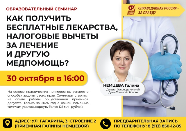 В своей общественной приемной депутат Законодательной Думы Томской области Галина Немцева расскажет, как получить бесплатные лекарства, какие расходы на лечение можно компенсировать в 2025 году, какие документы необходимы для оформления налогового вычета. На семинаре участники смогут задать интересующие вопросы, получить практические рекомендации и узнать обо всех изменениях в законодательстве на эту тему.