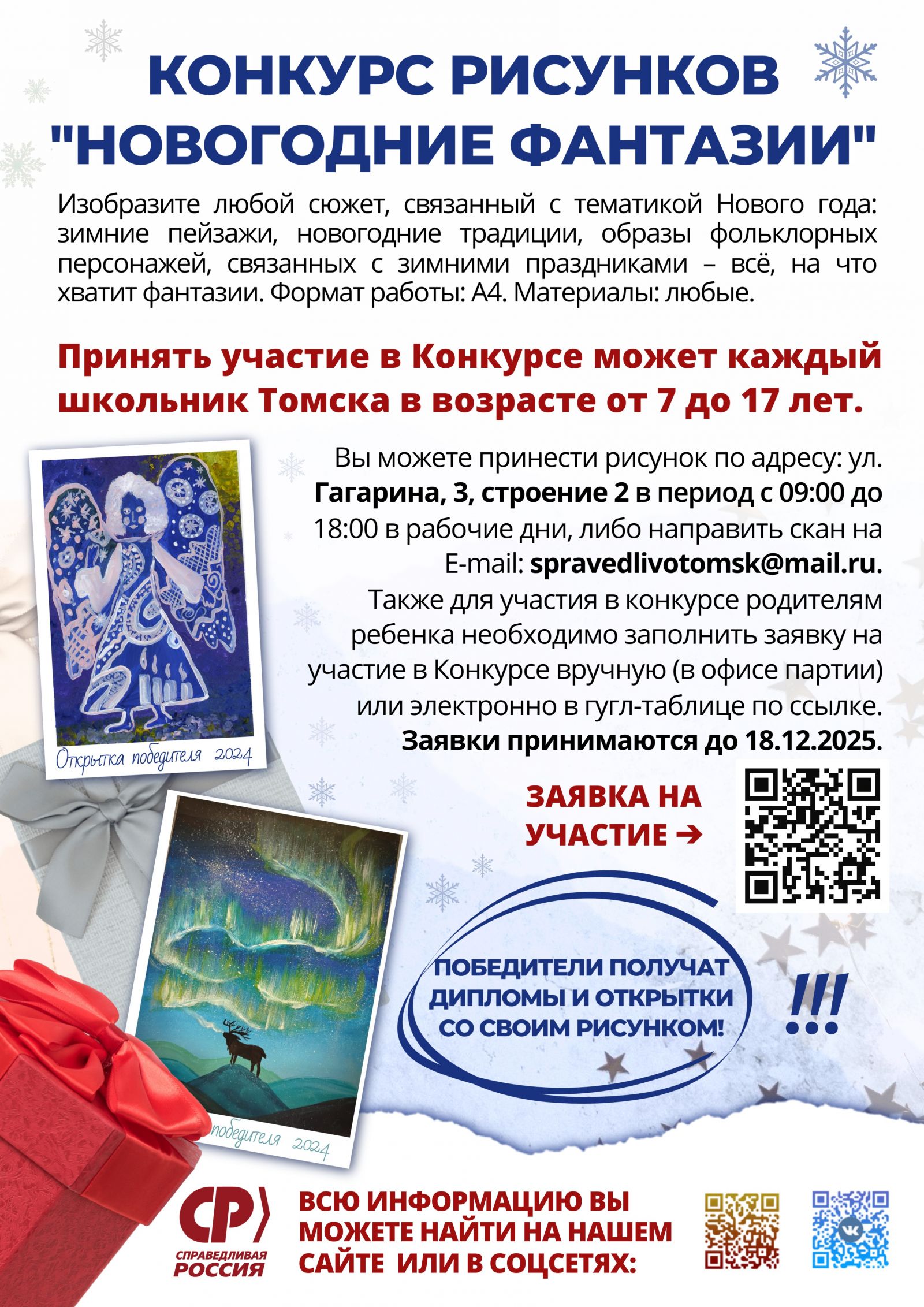 К Новому году Региональное отделение партии СПРАВЕДЛИВАЯ РОССИЯ в Томской области вновь объявляет детский Конкурс рисунков и иллюстраций "Новогодние фантазии-2026"!