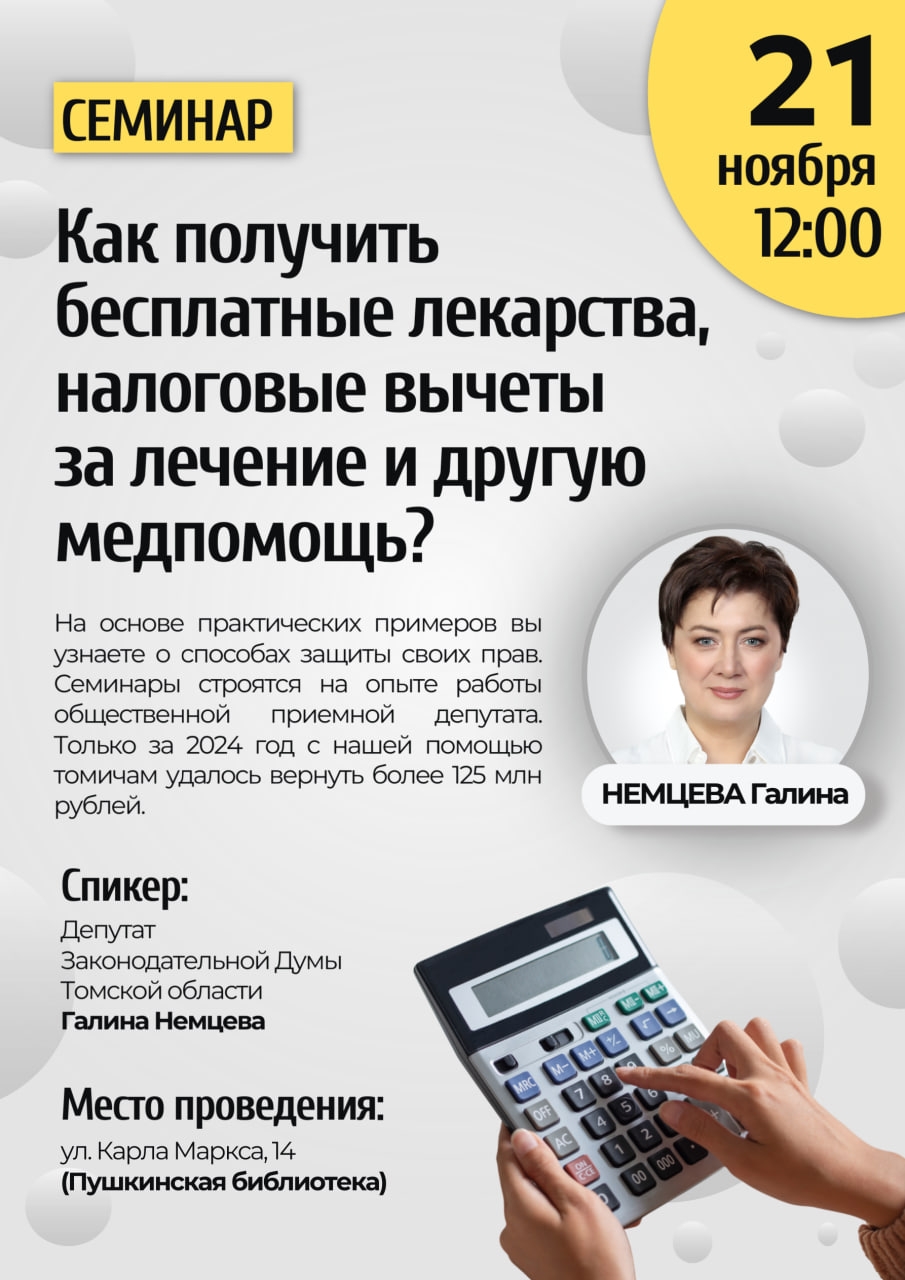 Напоминаем, что уже завтра депутат Галина Немцева проведет образовательный семинар "Как получать бесплатные лекарства, налоговые вычеты за лечение и другую медицинскую помощь" в библиотеке им. А.С. Пушкина (ул. Карла Маркса, 14).