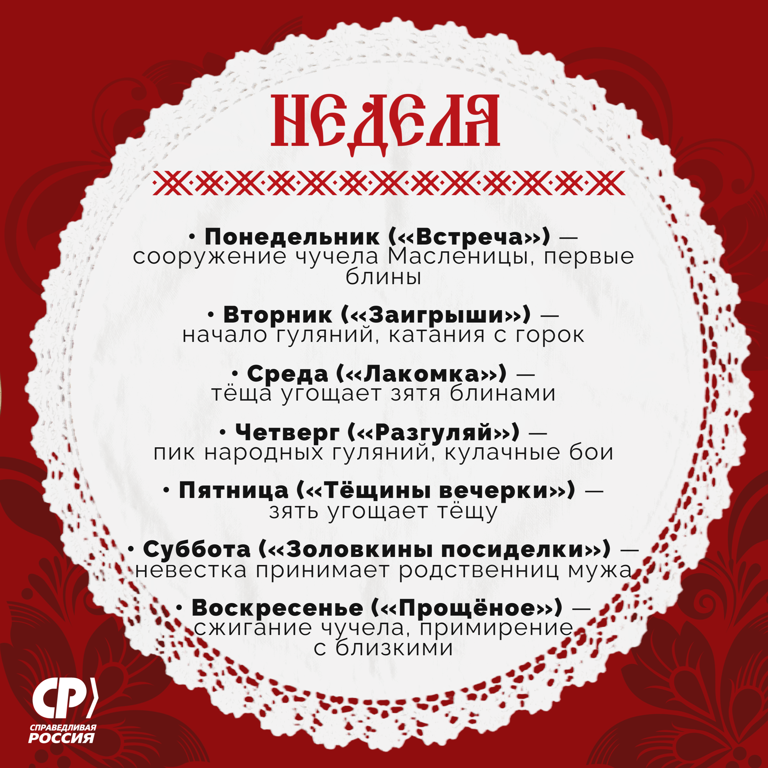 Каждый день Масленичной недели имеет своё название и особые обычаи:
