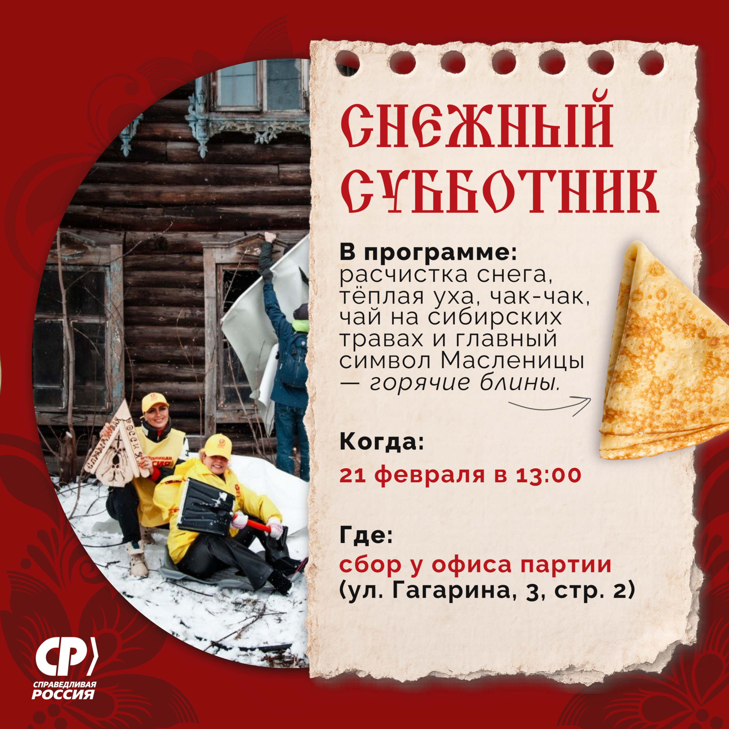 Встречаемся в 13:00 у офиса партии (ул. Гагарина, 3, стр. 2). Вместе расчистим снег, согреемся ухой и сибирским чаем, а в завершение – как и положено в Масленицу – угостим всех горячими блинами.